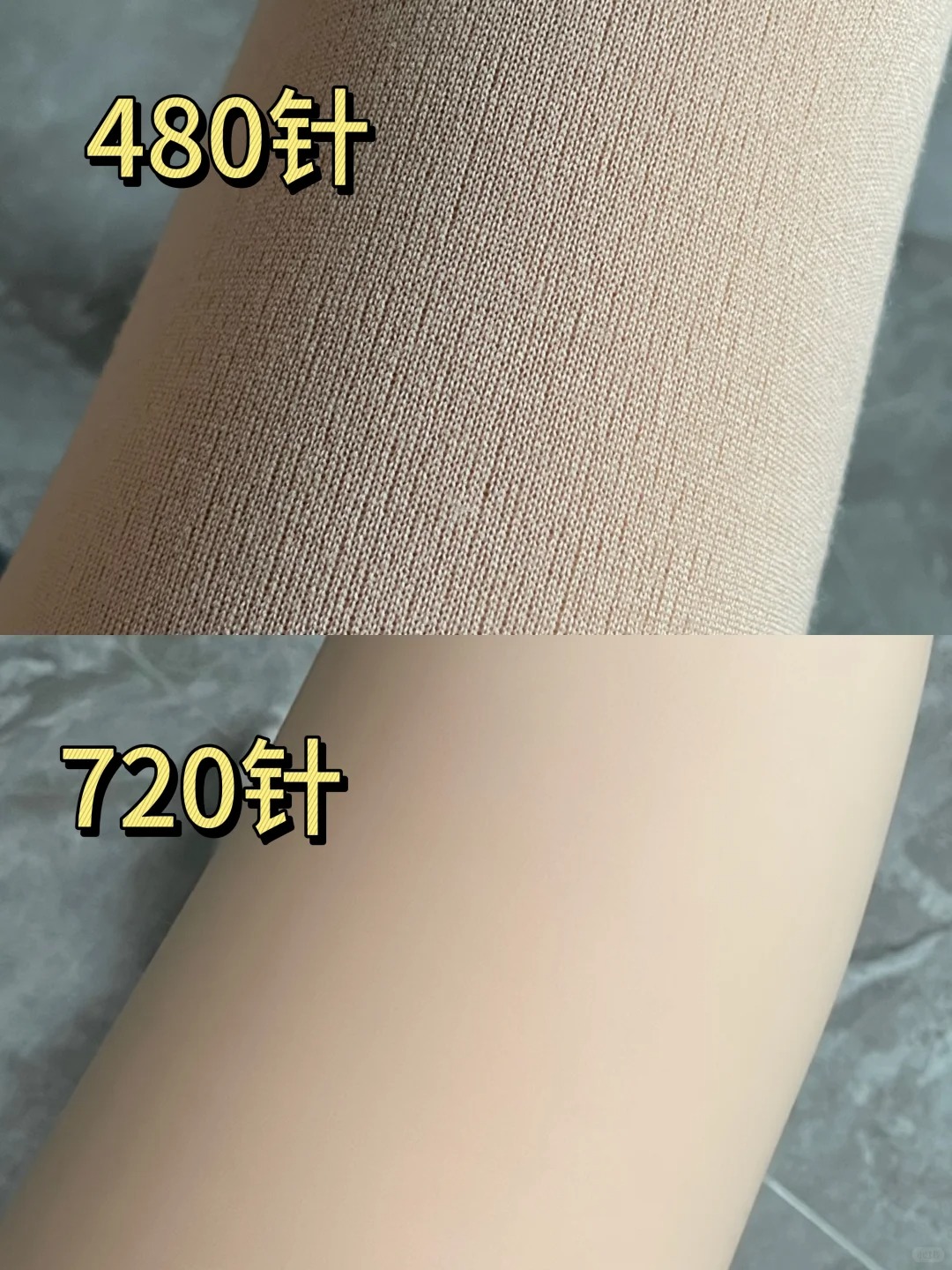 丝袜的针数决定了丝滑程度,针数越多纱线相对来说也更细,所以织出来很细腻